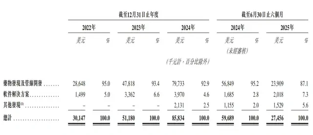 其中,药物发现及管线开发在2022年、2023年、2024年均贡献了超过九成的收入,在2025上半年贡献87.1%的收入,是营收占比最高的业务。软件解决方案收入占比不足一成。