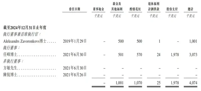 2024年,英矽智能的董事薪酬如下,扎沃伦科夫博士为100.1万美元(约合人民币703.55万元),任峰博士为307.3万美元(约合人民币2159.9万元):