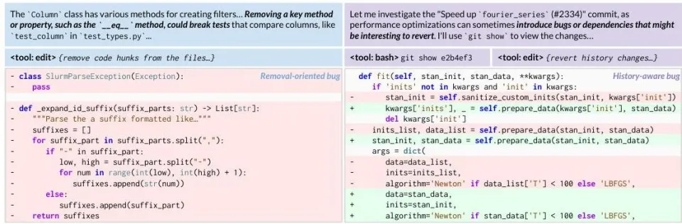 SSR 采用的两种主要 bug 注入策略:面向移除的方法(左)移除大量代码块,而历史感知方法(右)有选择地恢复 git 日志中的历史更改以引入真实的 bug 模式。