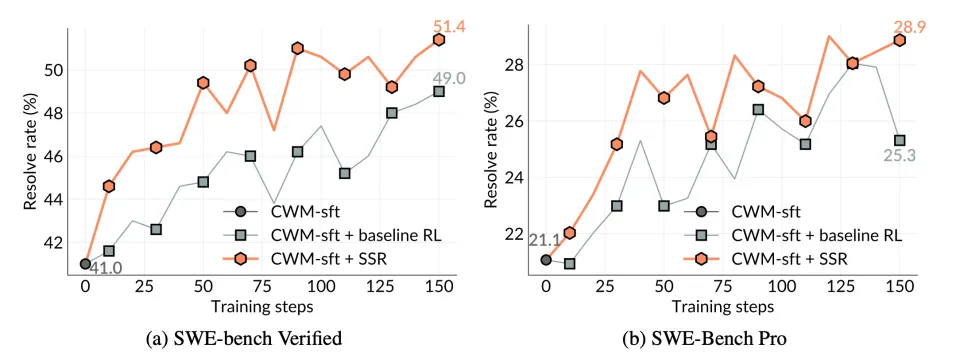 在 SWE-bench Verified 与 SWE-Bench Pro 基准测试上,SSR 展现出显著的自我提升能力(分别提升 +10.4 与 +7.8 个百分点),并在整个训练过程中持续超越依赖人工数据的基线方法 —— 尽管模型的评测对象仍然是自然语言描述的问题,而这些描述在自博弈训练阶段完全未出现过。