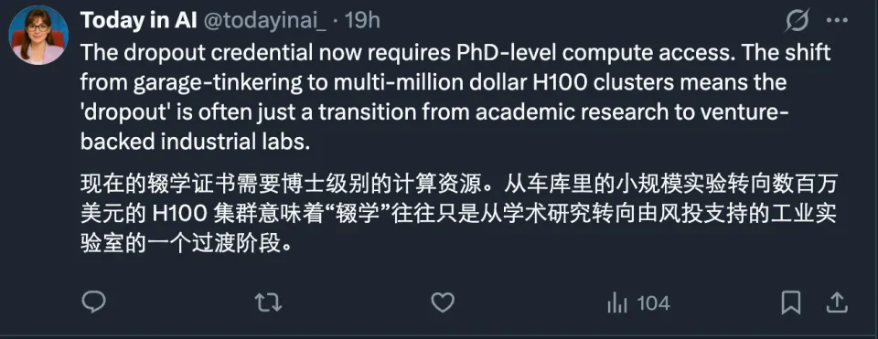 也有人指出,今天所说的「辍学」其实和早些年已经完全不一样了,那些「辍学」的人只是换了个地方,还是继续做原来的事情,而且是在资源更丰富的工业实验室。