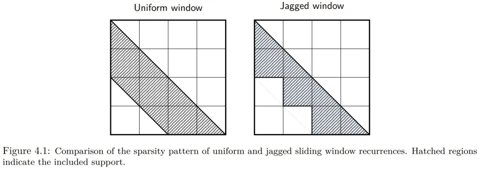 作者观察到,在实际训练的稳定系统中,系数 a_i 往往满足 ,这意味着输入对状态的影响会随距离呈指数级衰减。因此,强制维护长程依赖在数值上往往是冗余且昂贵的。SWR 采用了独特的锯齿状窗口(Jagged Window)结构,而非传统的均匀窗口,这种结构能自然地对齐硬件的工作负载。