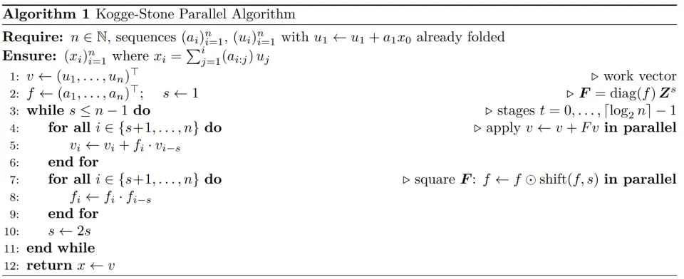 传统的并行扫描算法,如 Kogge-Stone,具有极低的算法深度,但其数据访问模式往往跨越全局地址空间,导致频繁的全局内存同步和洗牌操作。