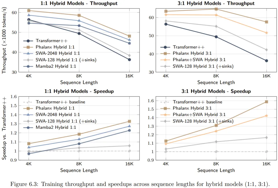 在 8K 上下文的训练任务中,Phalanx 混合模型的训练速度比传统的 SWA/Attention 混合架构快 28%,甚至在短序列长度下也表现卓越,在 Hopper GPU 上比纯注意力模型提升了 10% 的训练吞吐量。