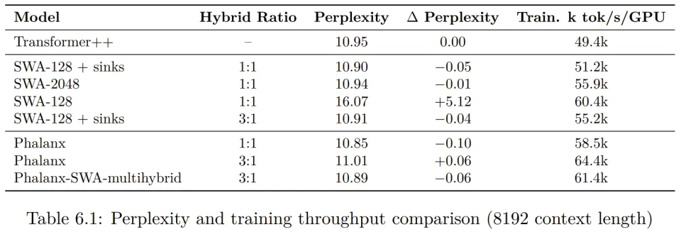 Phalanx 被定位为混合架构中的「局部专家」,专门负责高效捕获短程令牌互动,而将长程路由任务交给全局注意力层。这种职能分工使得模型能够在不损失精度的前提下,大幅减少跨内存层级的数据移动。