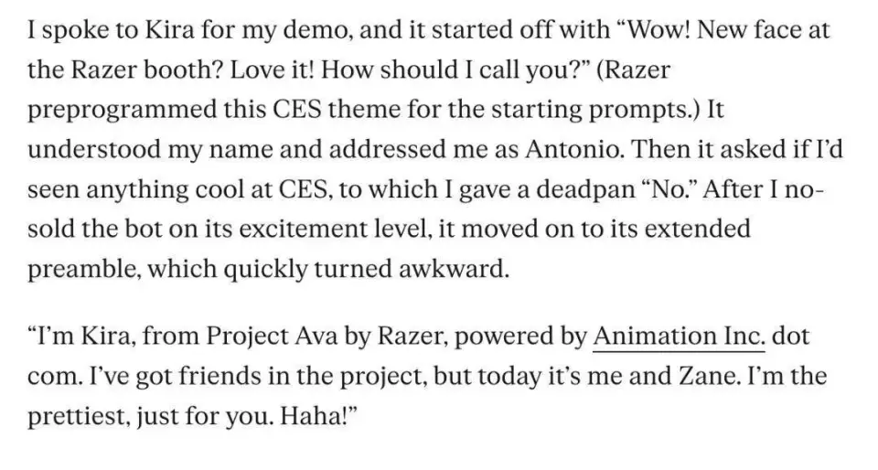 接着就开始询问是否在展会上看到新鲜好东西,在得到否定回答后,Kira 就开始大段的自我介绍,「我是 Kira,来自 Razer 的 Project Ava 项目,由 Animation Inc. dot com提供技术支持,我在这个项目里还有其他朋友,但今天只有我和 Zane。我是最漂亮的,只为你而漂亮。哈哈……」