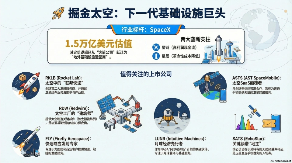 SpaceX 完成了从“造火箭”到“定规则”的跨越。ASTS/RKLB/RDW 正在应用层抢占高地。投资者关注的不再是火箭是否会爆炸,而是这台巨大的“轨道提款机”每年实打实的营收和利润。