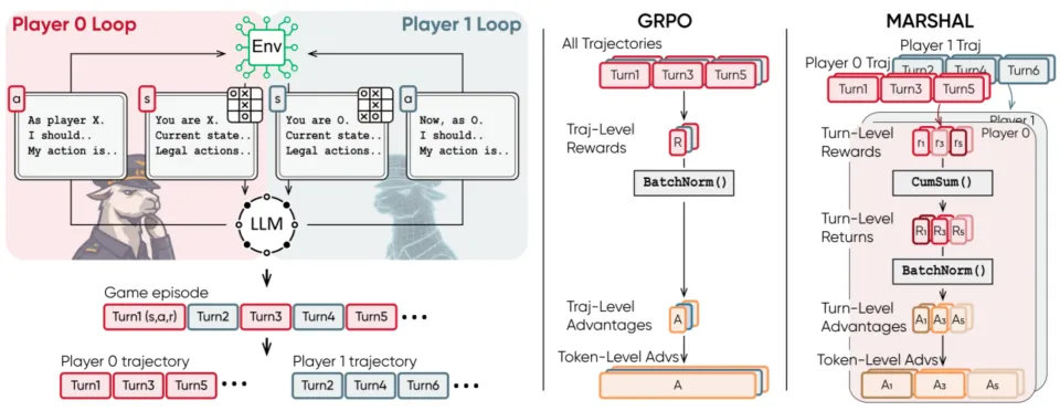 面向策略游戏自博弈中多轮次、多智能体训练的挑战,MARSHAL 基于 Group-Relative Policy Optimization (GRPO) 架构,提出了两项关键算法改进: