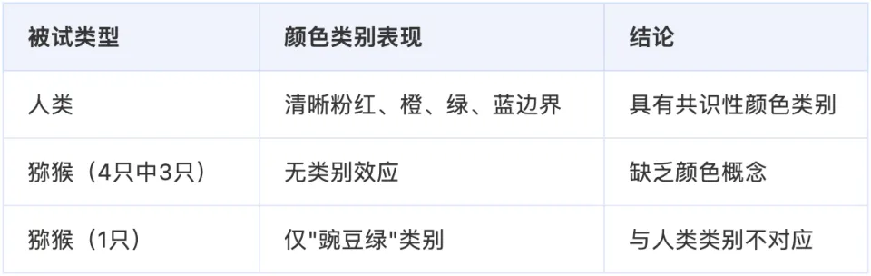 猕猴与人类拥有几乎相同的视锥细胞和中枢视觉回路——它们看到的颜色光谱与我们完全一样。唯一的区别是:它们没有语言。研究者让猕猴记住一个彩色圆盘,短暂延迟后从四个选项中找出匹配颜色,通过分析数千次试验中的选择偏差来推断猕猴是否拥有颜色类别。结果令人震惊: 四只猕猴中只有一只显示出微弱的类别效应,而且那个类别(豌豆绿)与人类的任何颜色类别都不对应。 相比之下,人类被试清晰地展现出粉红、橙色、绿色和蓝色的类别边界。这意味着:共识性的颜色类别,那些让全世界人类都同意天空是"蓝色"而非"绿色"的认知结构,很可能依赖于语言,而非视觉系统的固有属性。京都大学谷口忠大团队引入了一个关键概念: 感质结构(qualia structure) ——不同主观体验之间的关系模式。红色的体验比蓝色更接近粉色,这种"接近"与"远离"的关系网络,构成了我们内心世界的隐秘几何。标题 :