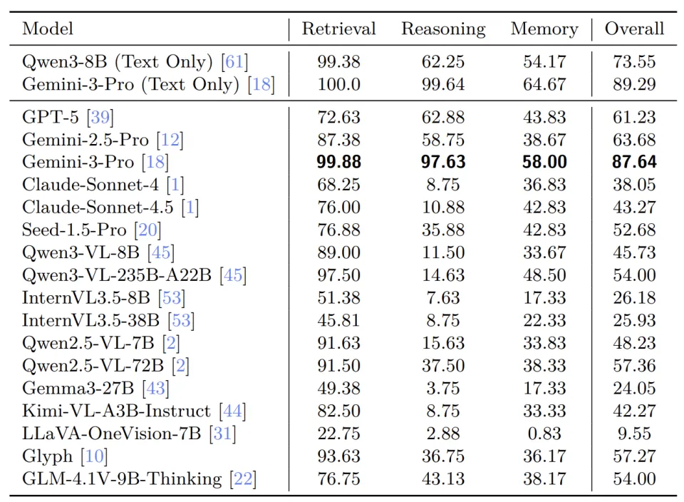 Gemini-3-Pro 在 VTCBench-Wild 上表现惊艳,其视觉理解能力已几乎追平其纯文本基准,证明了 VTC 是实现大规模长文本处理的极其可行的路径!