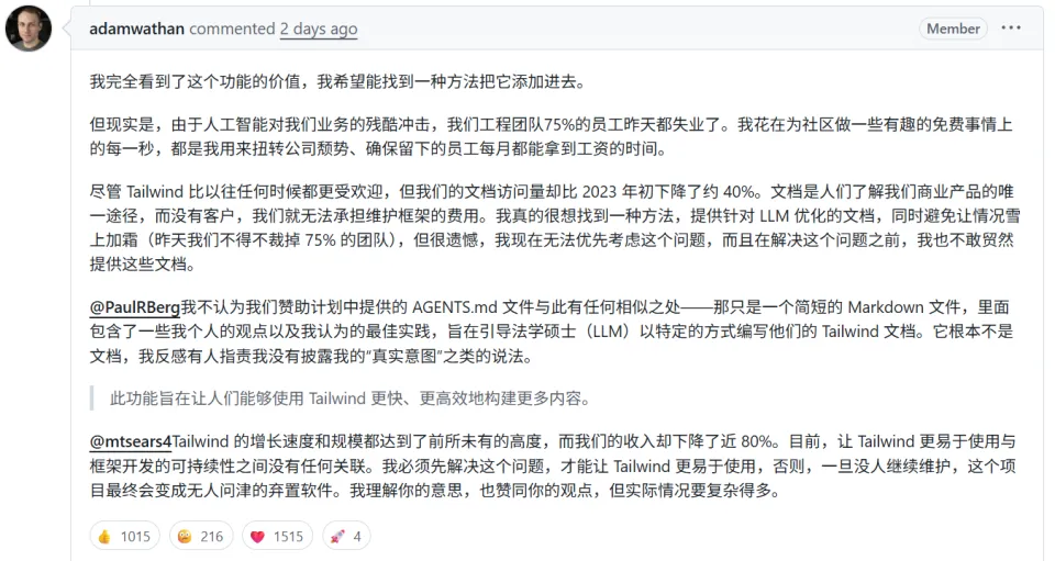 这时候,Adam Wathan 现身解答了疑惑,并表示 Tailwind 公司已经陷入了财务困境,而让 LLM 更容易阅读文档会让问题更加严重。Tailwind 的商业模式依赖于开发者访问官方文档,进而在页面上接触到他们的付费产品(如 UI 组件库 Tailwind UI)。然而,随着 Cursor 等 AI 编程工具的普及,开发者不再需要查阅文档,AI 可以直接生成代码。