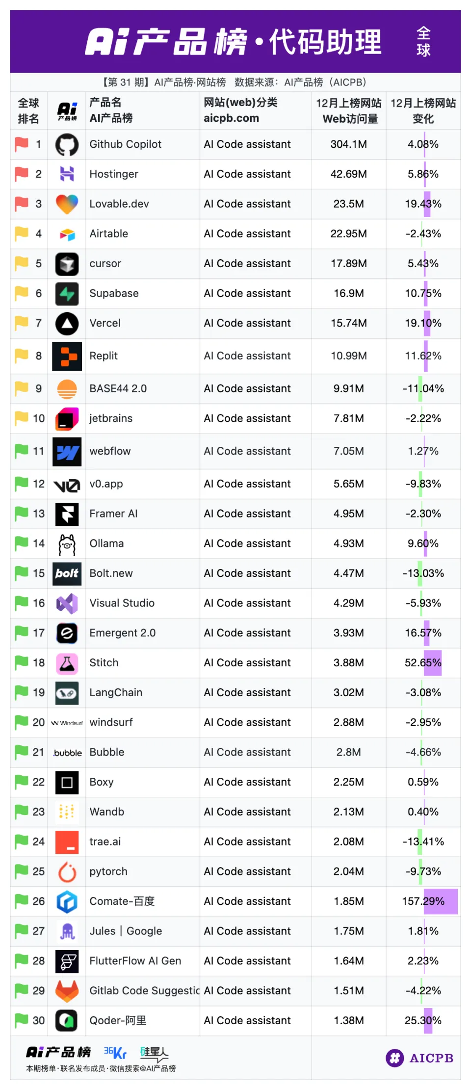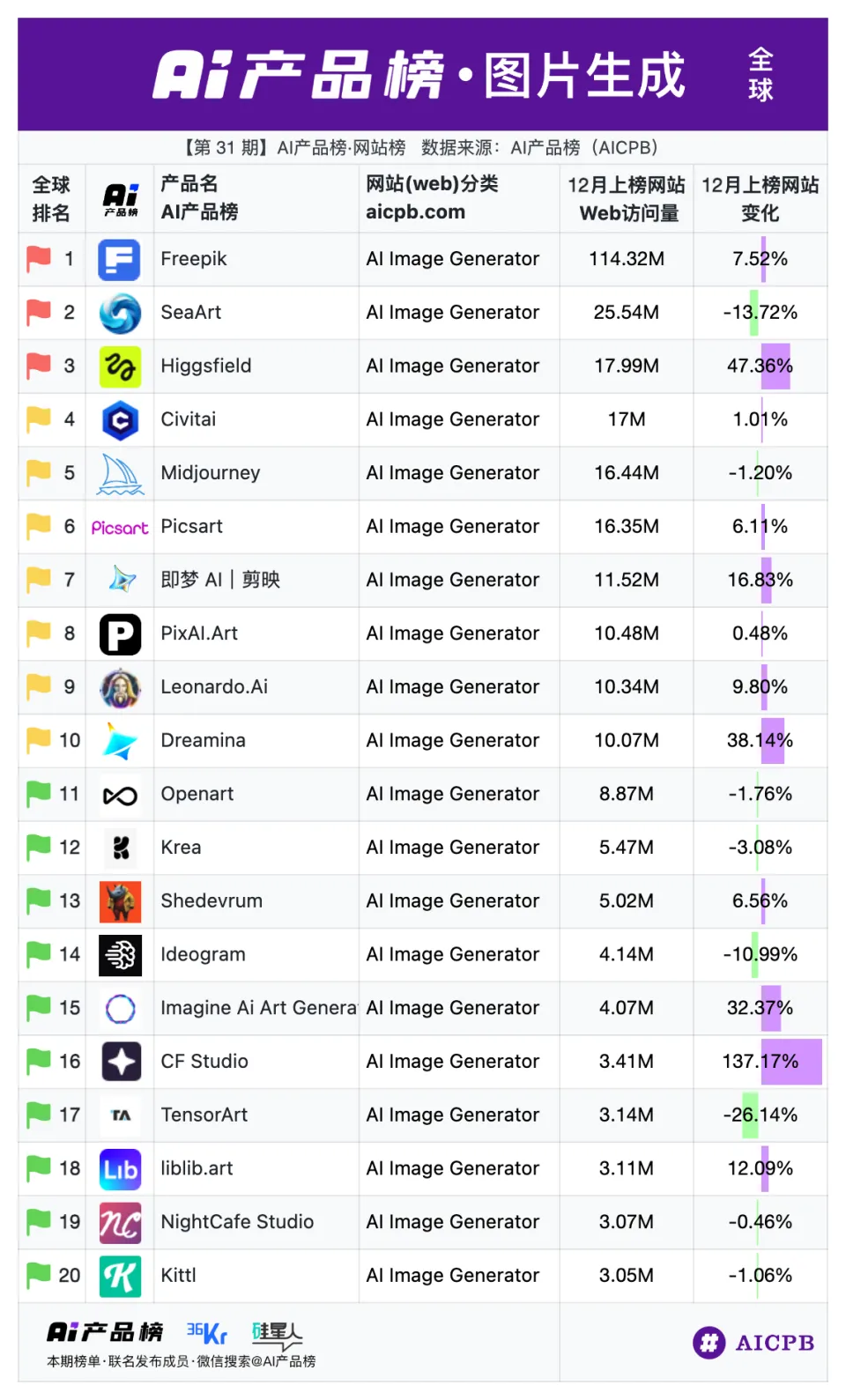 第 31 期AI产品榜·网站榜(Web)(2025年12月榜)由 AI产品榜、36kr、硅星人 联名发布。