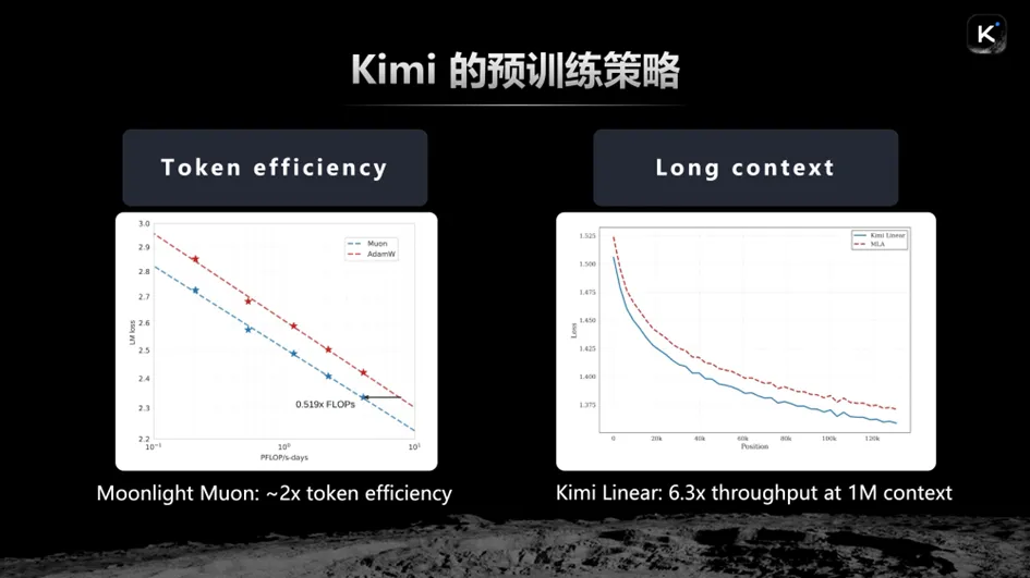 另一项重要工作是我们最新研究的Kimi Linear架构。这个架构的优点在于,它的positional loss随着上下文位置的拉长,下降幅度非常显著,这意味着它在各类长上下文任务上的效果将得到极大提升。