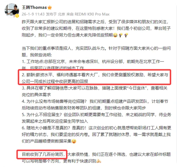 王腾还放出招聘广告,重点招聘软硬件产品经理、 健康 /AI 算法工程师、脑科学睡眠健康专家等岗位。王腾还解释为何选择睡眠健康、精力管理方向:1. 首先睡眠、精力已经成为每个人都关心的健康问题。2. 社会对睡眠的价值理解有待提升。3. 新时代下 AI 大模型发展迅速,让很多产品的体验能大幅提升。公开信息显示,北京今日宜休科技有限责任公司成立于 2026 年 1 月 6 日,由王腾持股 55% 并担任法定代表人,注册资本是 100 万人民币,注册地址是北京市海淀区。