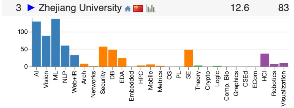 从图中可直观看出,浙大整体发表的论文数非常高。AI、ML领域占比最高。此外,视觉、NLP、安全等也很多。