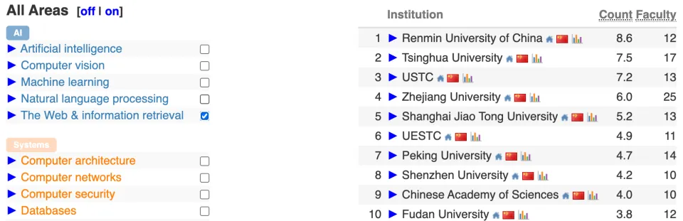 网页与信息检索:人大表现亮眼,位居第一,清华与中科大紧随其后。
