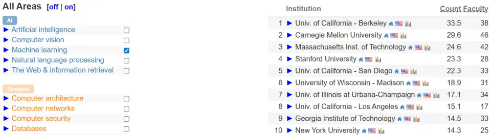 针对机器学习领域,UC伯克利成为第一,CMU、MIT分别是第二、第三。