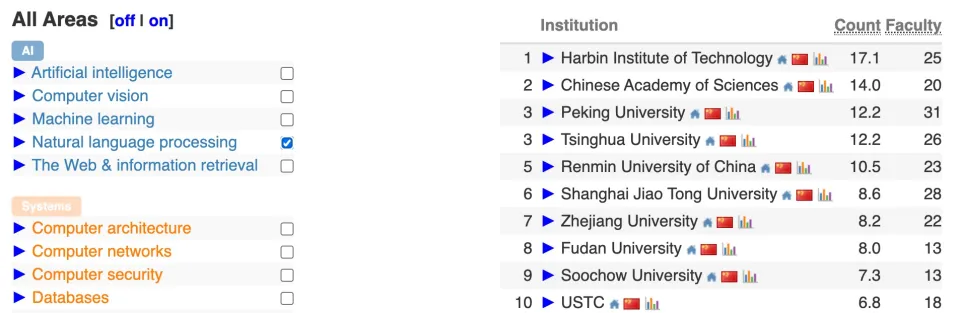 自然语言处理:哈工大登顶,中国科学院与北大分列二、三。
