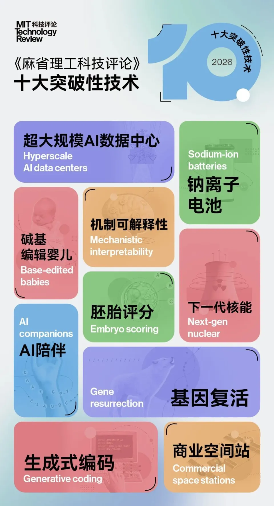 基于这一判断,《麻省理工科技评论》选出了 2026 年的十大突破性技术。它们涵盖多个维度:从能够精准编辑新生儿基因的碱基编辑技术,到试图让灭绝物种重返地球的“基因复活”;从承载人类太空雄心的商业空间站,到支撑 AI 算力指数级增长的超大规模数据中心……其中一些技术已进入落地阶段,另一些仍充满争议,但它们共同指向一个复杂却值得期待的未来。