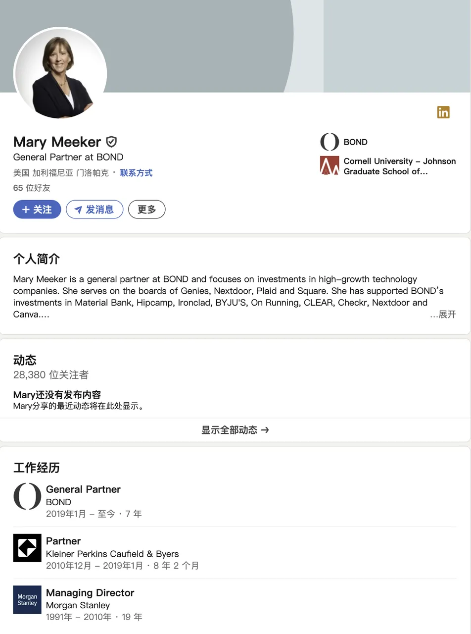提到 Mary Meeker,外界总标签她为 Quantitative investor。她在互联网泡沫时期是 Morgan Stanley 的股票研究员,然后来到 Kleiner Perkins。大家都在谈论她建立的 DCF 模型和她处理的所有数据,但她实际上是我共事过的最 Qualitative 的投资者。