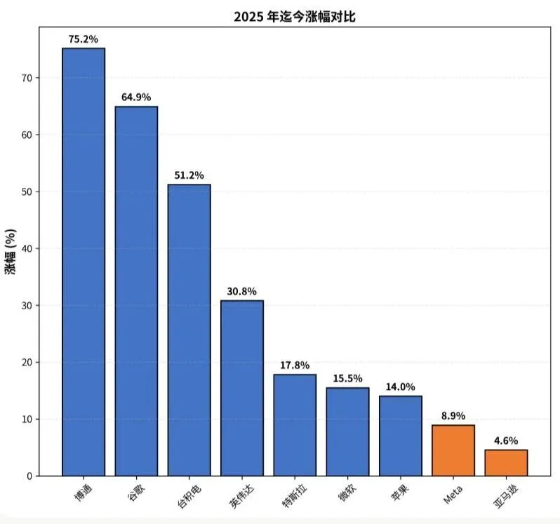 AI 时代的科技巨头和互联网时代最大的区别是,从收”流量税“到“基建税”的进化,尽管面临高昂 CapEx 带来的利润率压力,但“在每一笔 AI 交易中抽成”的确定性地位,使它们成为 AI 大规模应用(Massive Adoption)红利的最终且最大的捕获者。在这个逻辑下,Mag 9 在 2025 年也出现了分化,: