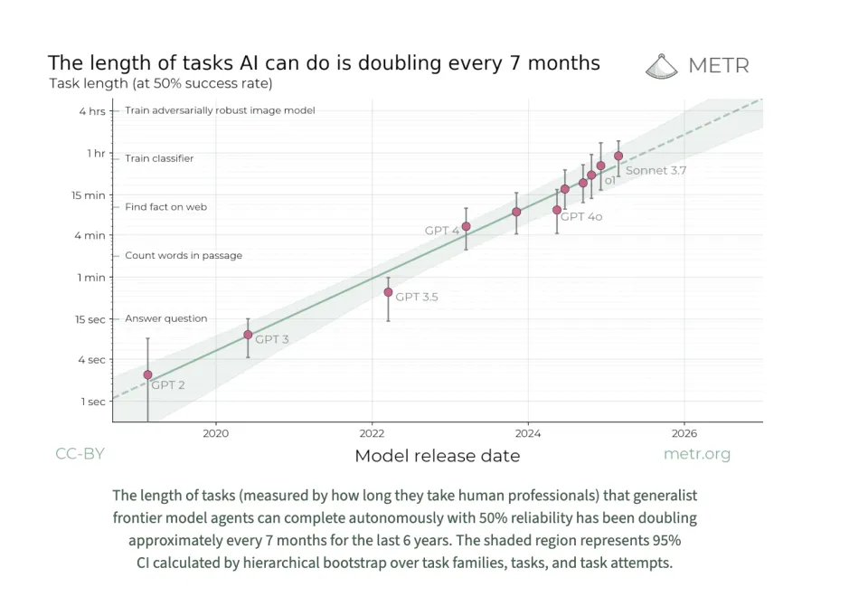 AI 独立研究机构 METR 的数据分析发现:Agent 能够完成的任务长度正以指数级增长,大约每 7 个月翻一倍,这也意味着预计 2029 年 agent 能够完成时长为 1 个工作月的任务。