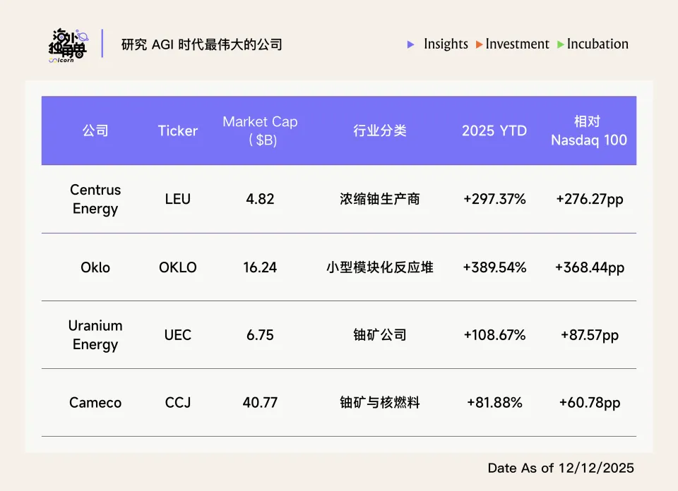 由于数据中心功耗爆炸式增长,2025 年,“有电”甚至成为了比“有卡”更稀缺的资产,一方面,拥有稳定基荷电力(Baseload Power)资产的公司享受了巨大的估值溢价,另一方面,核电成为唯一可靠的 24/7 基础负荷电源,OpenAI、Google、Microsoft 等超级大厂纷纷签署核电采购协议。美股核电板块公司代表公司在 2025 年的增幅都远超 Nasdaq100,最高超出 368 个百分点。