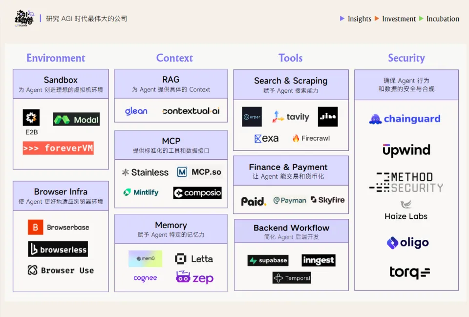 为了让 agent 更好地完成 long horizon 任务,Agent Infra 赛道因此全面升温,围绕 Environment、Context、Tools、Agent Security 等细分场景,模型公司、云厂商、初创公司都在积极布局,也出现了n8n、Supabase、Browserbase 等明星公司。