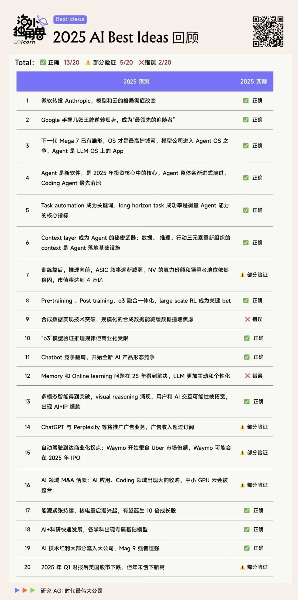 去年此时,我们在 2025 AI Best Ideas 中提出了 20 个关键预测,12 个月过去,当我们重新审视这份清单,惊奇地发现:我们对行业格局和技术路径的判断绝大部分都应验了,但其中也有对技术进步、基建成熟度、以及 AI 交易复杂性的过分乐观。