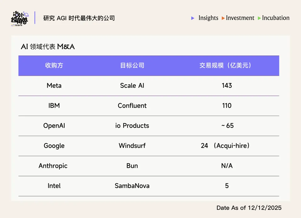 2025 年 AI 领域的收购相当活跃,其中既有科技巨头为了在 AI 浪潮不掉队的选择, 例如 Meta 收购 Scale AI ,Wix 收购 base44,也有 AI-native 团队出于业务和产品补充对中小型团队的收购,例如 OpenAI 在今年一系列收购交易:Context.ai、Crossing Minds、Roi,以及 Alex 等。