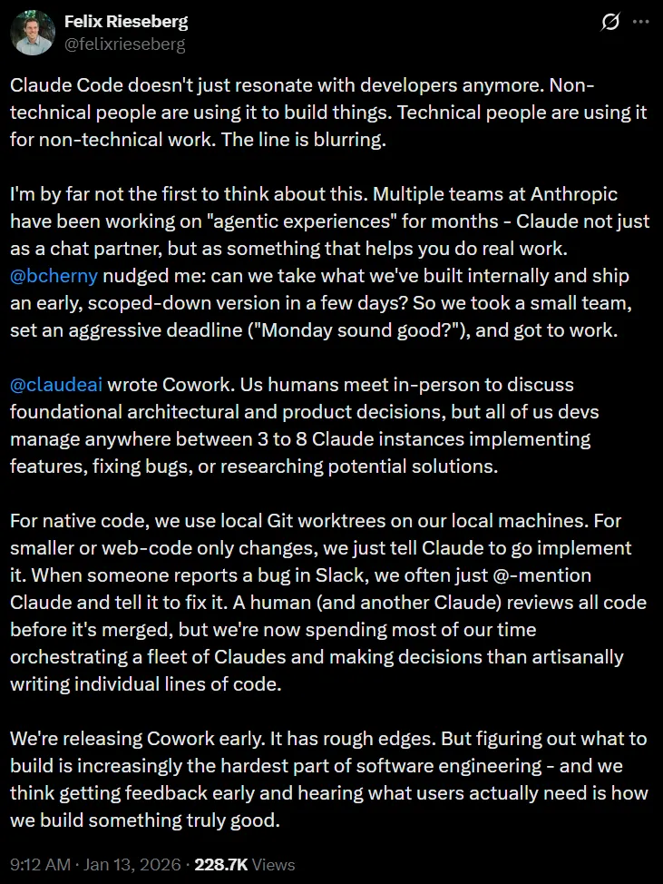 为此,Anthropic工程师Felix Rieseberg解答了团队主要参与的过程,就三件事: