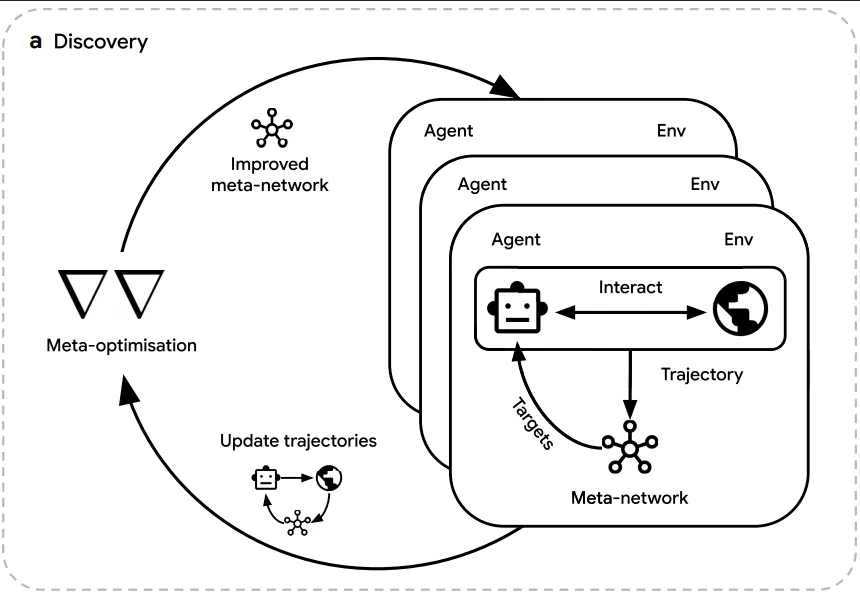 比如DeepMind 今年发表DiscoRL,它包含两个核心闭环:内部循环由Agent在Atari等游戏环境中试错,外部循环则由“老师”通过反向传播观察学生的表现,不断修正教学策略(即更新学习算法的参数)。这一过程让AI自主发现了想要得到最好的结果,得从“奖励最大化”转向“未来预测”,而且这些预测往往集中在重大事件(如Ahamoment和改变方向)发生之前。在这一过程中,教师独立“重新发现”了RL中的自举法,证明了AI可以通过这种递归的抽象从纯粹经验中真的学习到应该如何去探索。