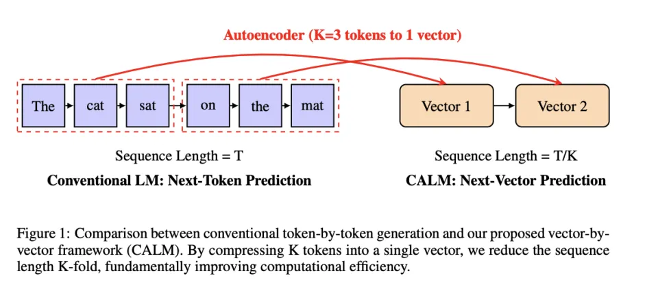 除了在传统的Token层面优化注意力,2025年的另一个重要趋势是打破离散Token的限制,向连续空间(Continuous Space)演进。这以“大型概念模型”(Large Concept Models, LCM)和腾讯的CALM(Continuous Autoregressive Language Models)为代表。