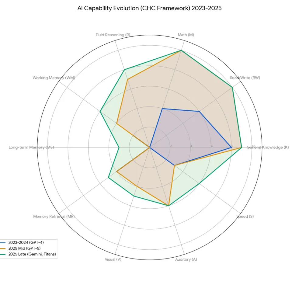 第一,2025年,技术进步主要集中在流体推理(Fluid Reasoning)、长期记忆(Long-term Memory)、空间智能(Spatial Intelligence)以及元学习(Meta-learning) 这四个领域。原因在于Scaling Law在单纯的参数规模上遇到了边际效应递减,为了突破AGI的瓶颈,业界被迫寻找新的增长点,即从“把模型做大”转向把“模型做聪明”。