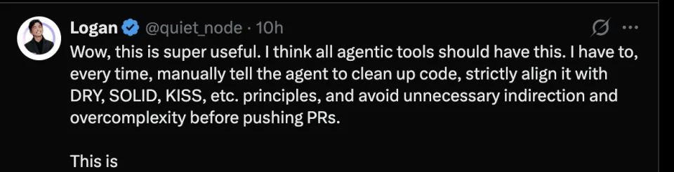 “太实用了!我觉得所有智能代理工具都应该具备这个功能。每次提交 PR 之前,我都要手动告诉代理清理代码,严格遵循 DRY、SOLID、KISS 等原则,避免不必要的间接性和过度复杂化。”