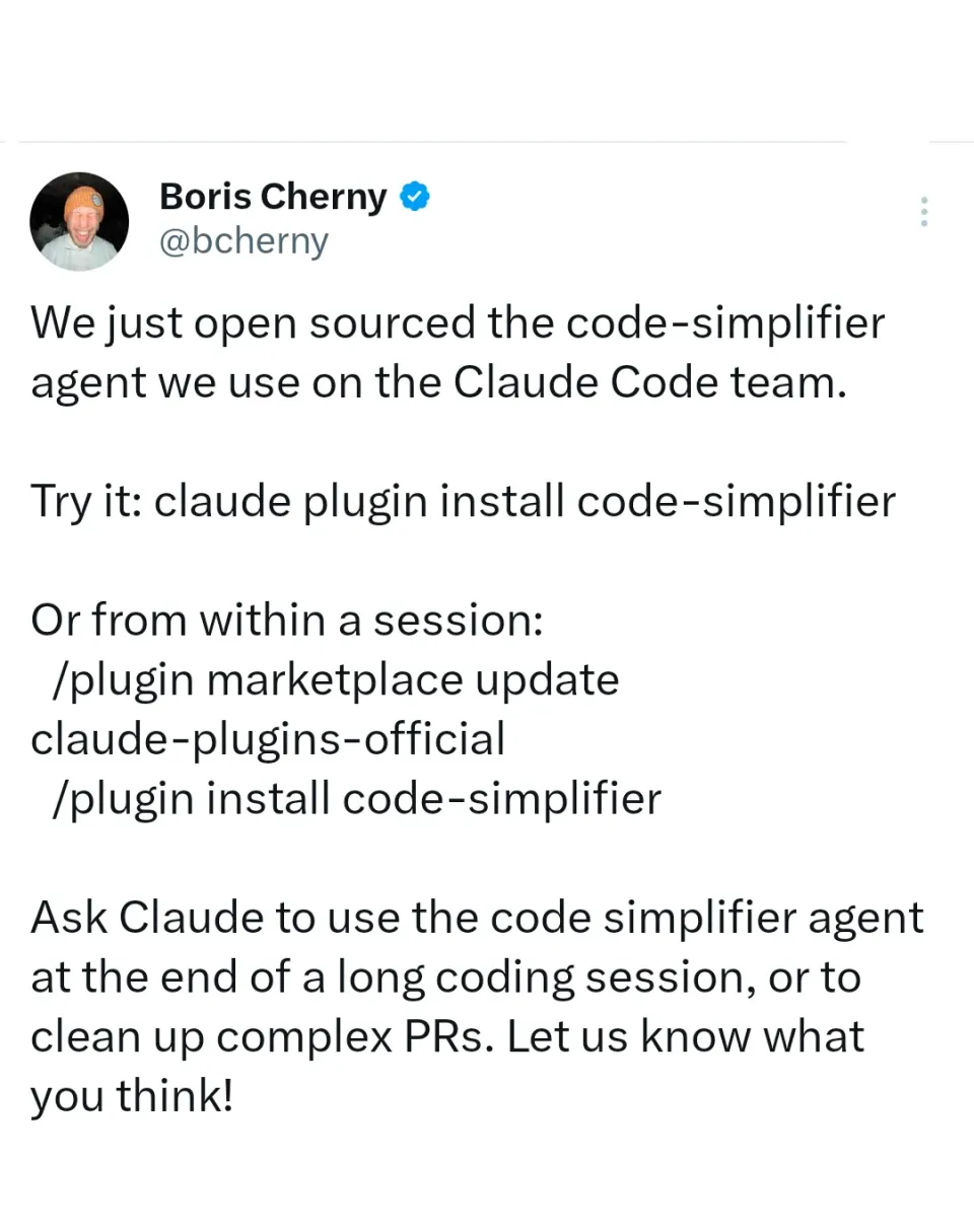 Claude Code 的创建者刚刚开源了他团队用来清理大型混乱 PR 的内部代码简化代理。它旨在长时间编码结束后运行,在不改变程序行为的前提下降低复杂度。该功能由 Claude Code 团队直接分享,现在可通过官方插件试用。