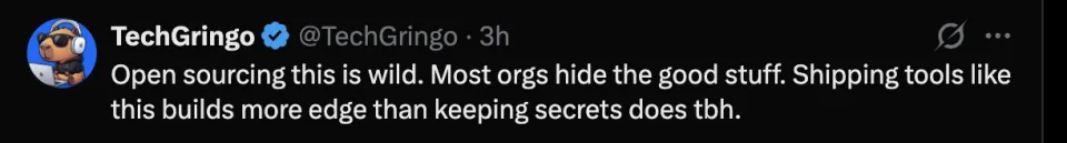“开源这个真是太棒了。大多数组织都会把好东西藏起来。说实话,发布这样的工具比保守秘密更能建立竞争优势。”