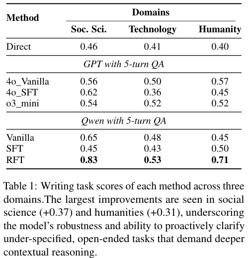 如表所示,在社会科学、技术和人文学科这三个主要领域,RFT 模型都取得了最佳成绩。