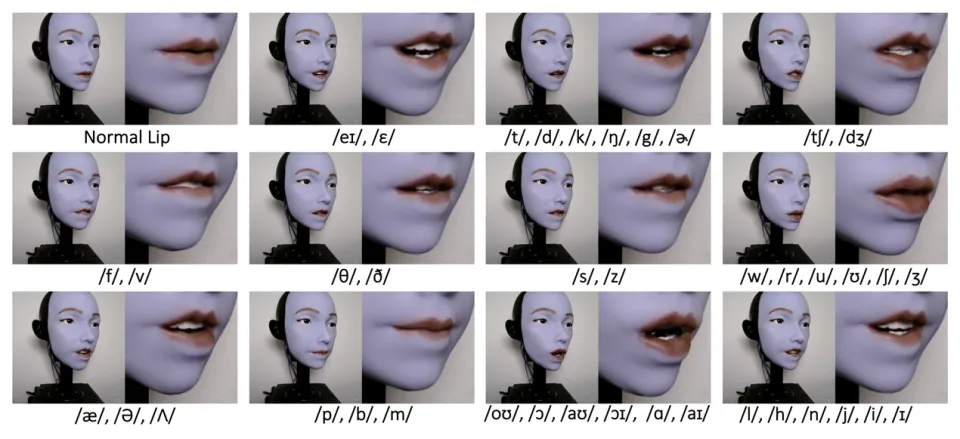 图 3. 机器人能实现的口型及其对应音标展示。该机器人展示了再现关键英语音标的能力,例如爆破音(/p/ 和 /b/)、双唇音(/m/)以及圆唇元音(/u/ 和 /o/)。通过独立控制上唇、下唇及嘴角,每帧图像均捕捉到其实现的典型唇部运动效果。这些数据为机器人在说话时实现正确的唇形匹配奠定了基础。
