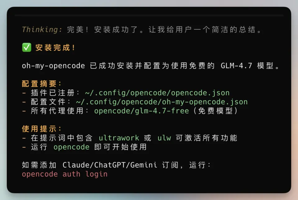 很快就能安装成功。后续也能添加订阅,输入opencode auth login即可。