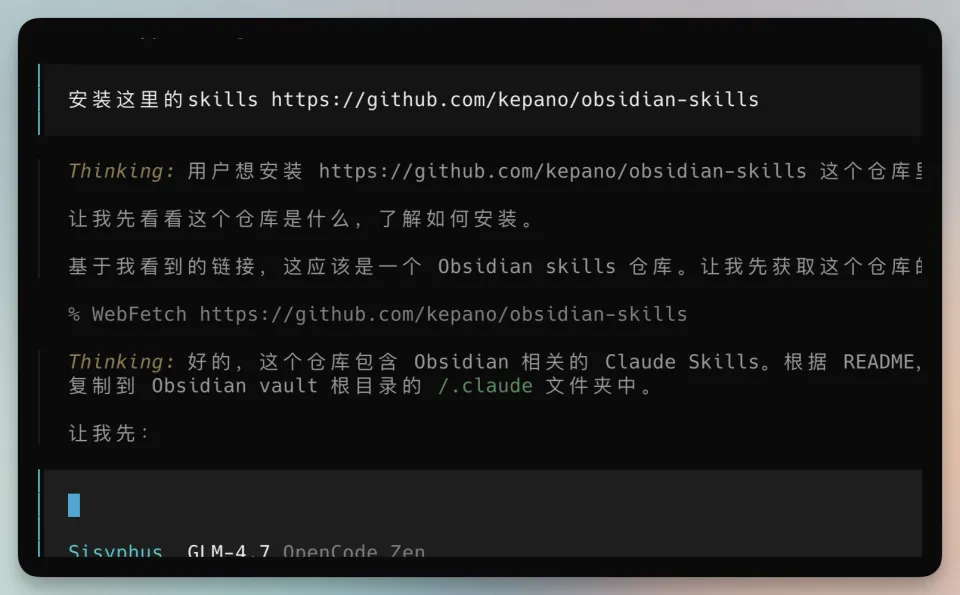 只需要打开Opencode,输入:“安装这里的skills https://github.com/kepano/obsidian-skills ”