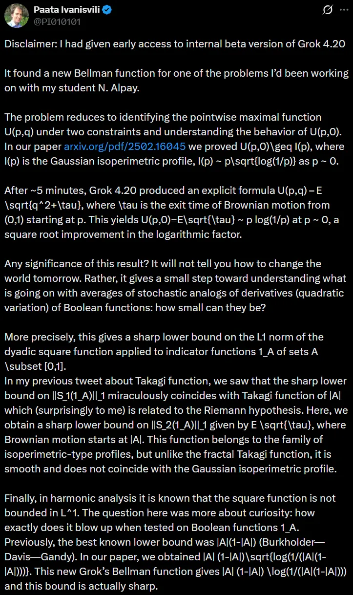 与此同时,马斯克的Grok 4.20也不装了,被曝在5分钟内「秒杀」了困扰教授们许久的Bellman函数难题。