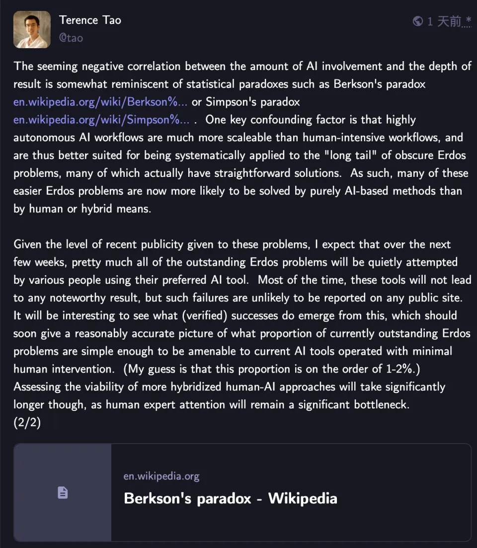 「这些相对容易的Erdős题目,未来更可能由AI纯自主解决,而非人类或人机合作。」他补充道。
