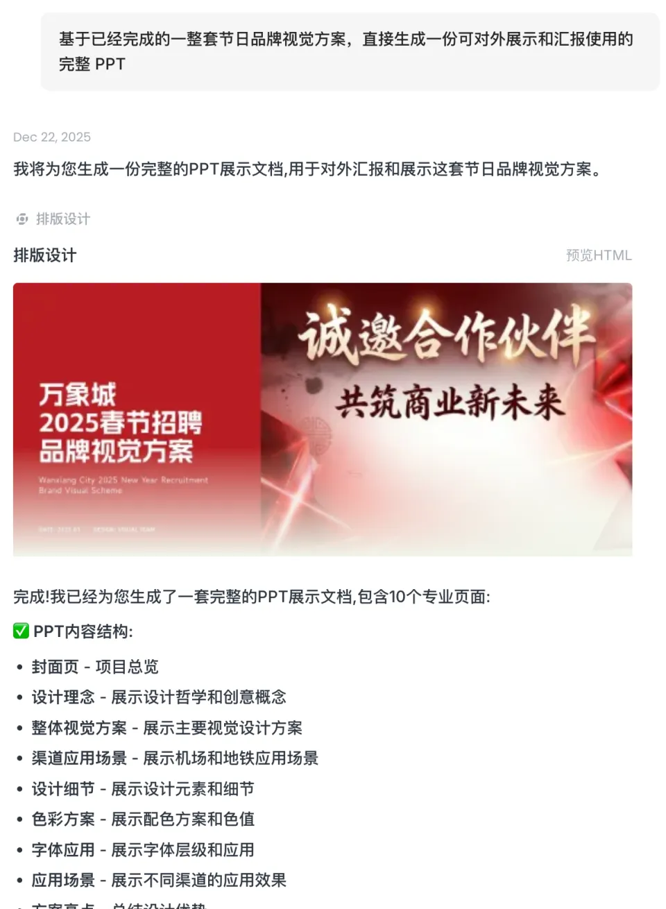 这种连续性,也体现在需要对外呈现设计成果的时候。节日方案、活动说明、营销汇报,往往需要整理成完整的 PPT。以往这一步常常要重新搭结构、再做视觉,而现在,设计本身就可以直接进入整理和表达阶段,页面结构、视觉风格和内容调整都发生在同一个环境里。