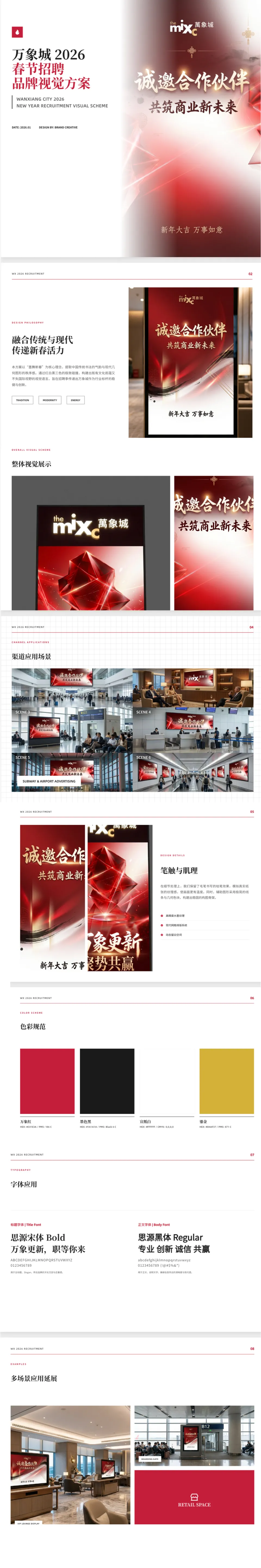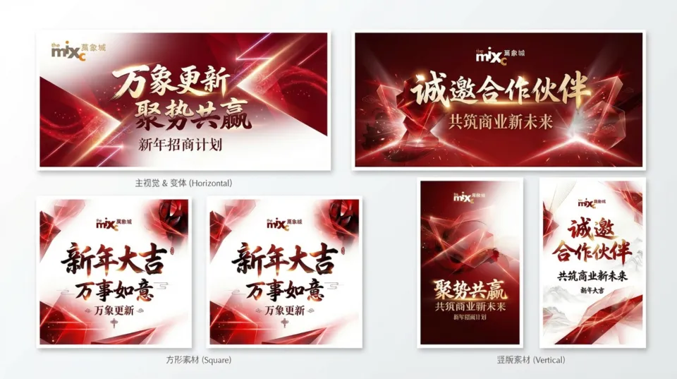 上一套节日方案在结构和气质上已经很完整,但在真实项目里,往往还需要再往前一步。比如年底给万象城做一整套招商或传播方案时,视觉不只是“好看”,而是要更有意境、更有文化指向,字体本身就要承担情绪和态度,而不是简单的信息承载