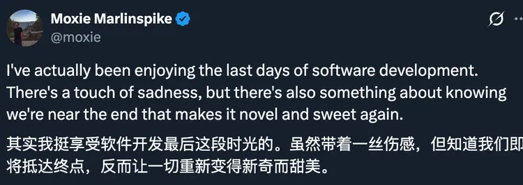 Signal创始人Moxie Marlinspike的态度更复杂。他说自己在享受软件开发的最后时光,有一丝悲伤,但知道接近终点,反而让它变得新奇而甜蜜。