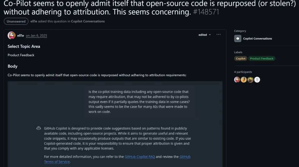 1 月 6 日,有开发者在 GitHub 上提交一项讨论,称其发现“Copilot 似乎公开承认其对开源代码进行了再利用(或盗用?),且未遵守署名规定”。