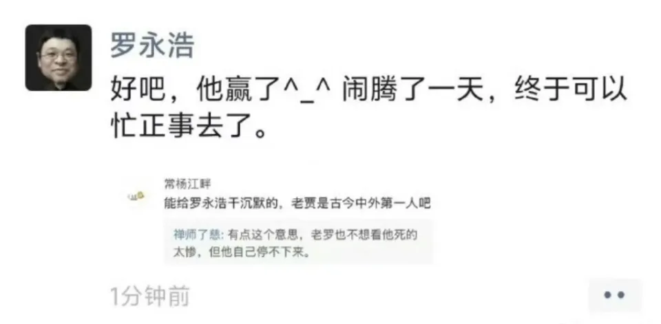 随后,罗永浩在朋友圈最新发文,「好吧,他赢了^^闹腾了一天,终于可以忙正事去了。」(来源:新浪微博)