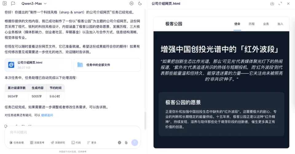 我还试着让千问基于极客公园的介绍文档,做了一个极客公园的网页,可以看到页面上每一个按钮都不是摆设,都是可以有效交互的,对应的链接跳转也准确无误。用户还可以根据风格喜好,提出对设计和视觉的要求。