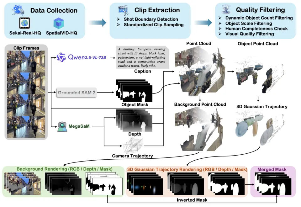 自动化标注引擎: 结合了 Qwen2.5-VL-72B(生成描述)、Grounded-SAM2(物体分割)、MegaSaM(深度和相机位姿估计)等最先进的工具,自动从视频中提取 4D 几何信息;
